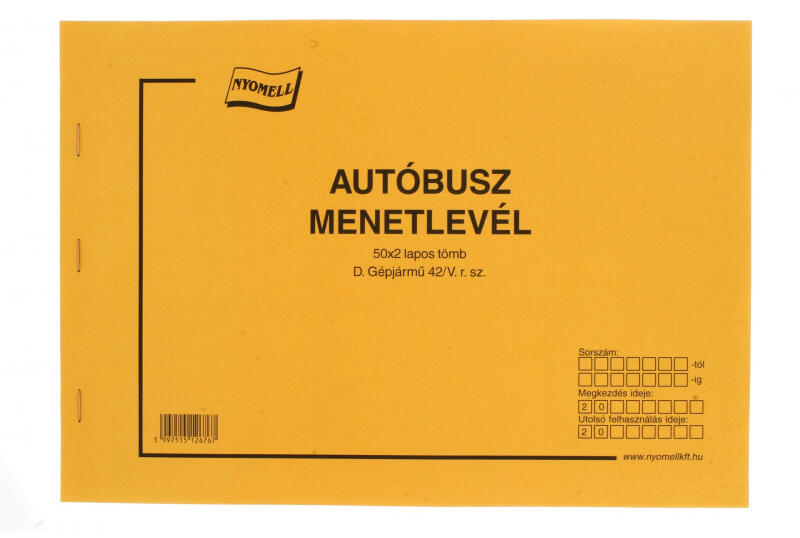 Nyomell "autóbusz menetlevél" D. 42/V. r. sz. 50x2 lap, A/4 méretű, kapoccsal összetűzött tömb. 2 példányos, ötátírós, perforált lapok. Elő-és hátlapja kemény katonlap.